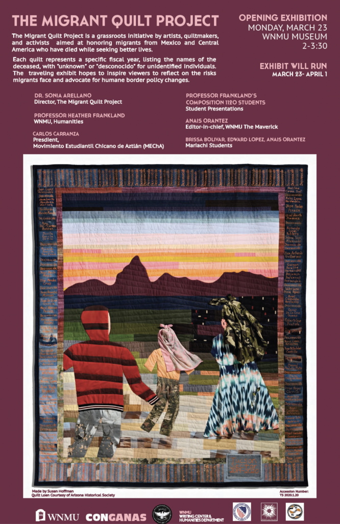 Join us on Monday, March 23, from 2-3:30 PM at the WNMU Museum for a powerful exhibit showcasing compassion for migrants from Mexico and Central America who died in the Southern Arizona deserts on their way to create better lives for themselves and their families. Each quilt symbolizes a specific fiscal year, featuring the names of those who have lost their lives in search of a better future.